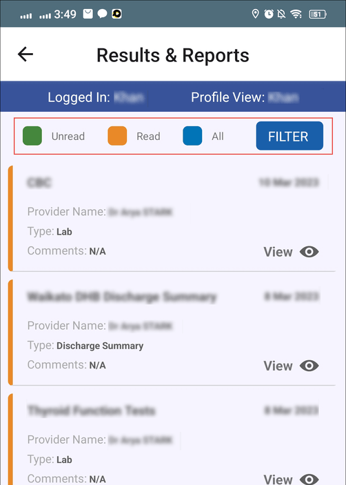 Here you can find your lab/radiology results. Unread results/reports will display under the Green header. Read results/reports will display under the Orange header. You can filter to see only unread or only read by clicking on the respective filter.